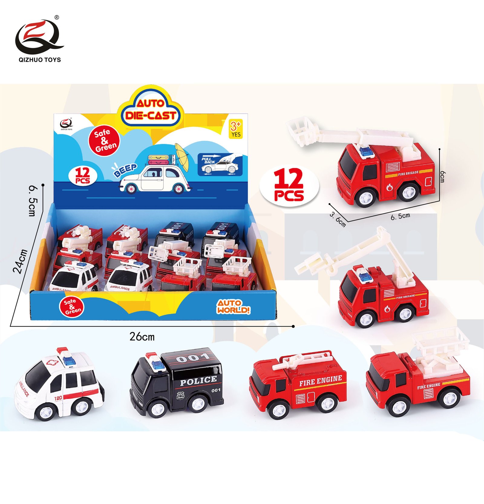 QZ208-3B 1:55 Cartoon Style Fire Diecast Pull Back Car, 6 Styles Mixed, 12 Pcs/Pdq