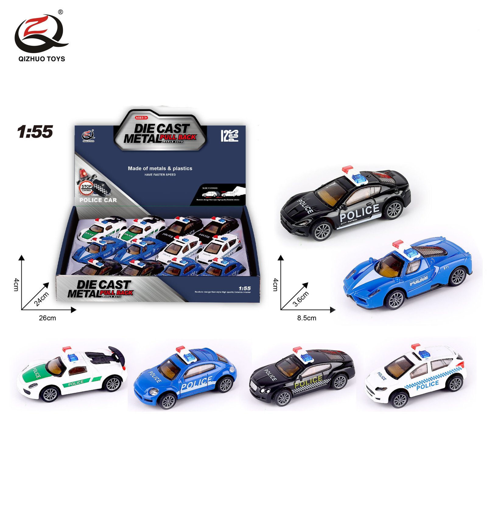 QZ625-G 1:55 Police Diecast Pull Back Car, 6 Styles Mixed, 12 Pcs/Pdq