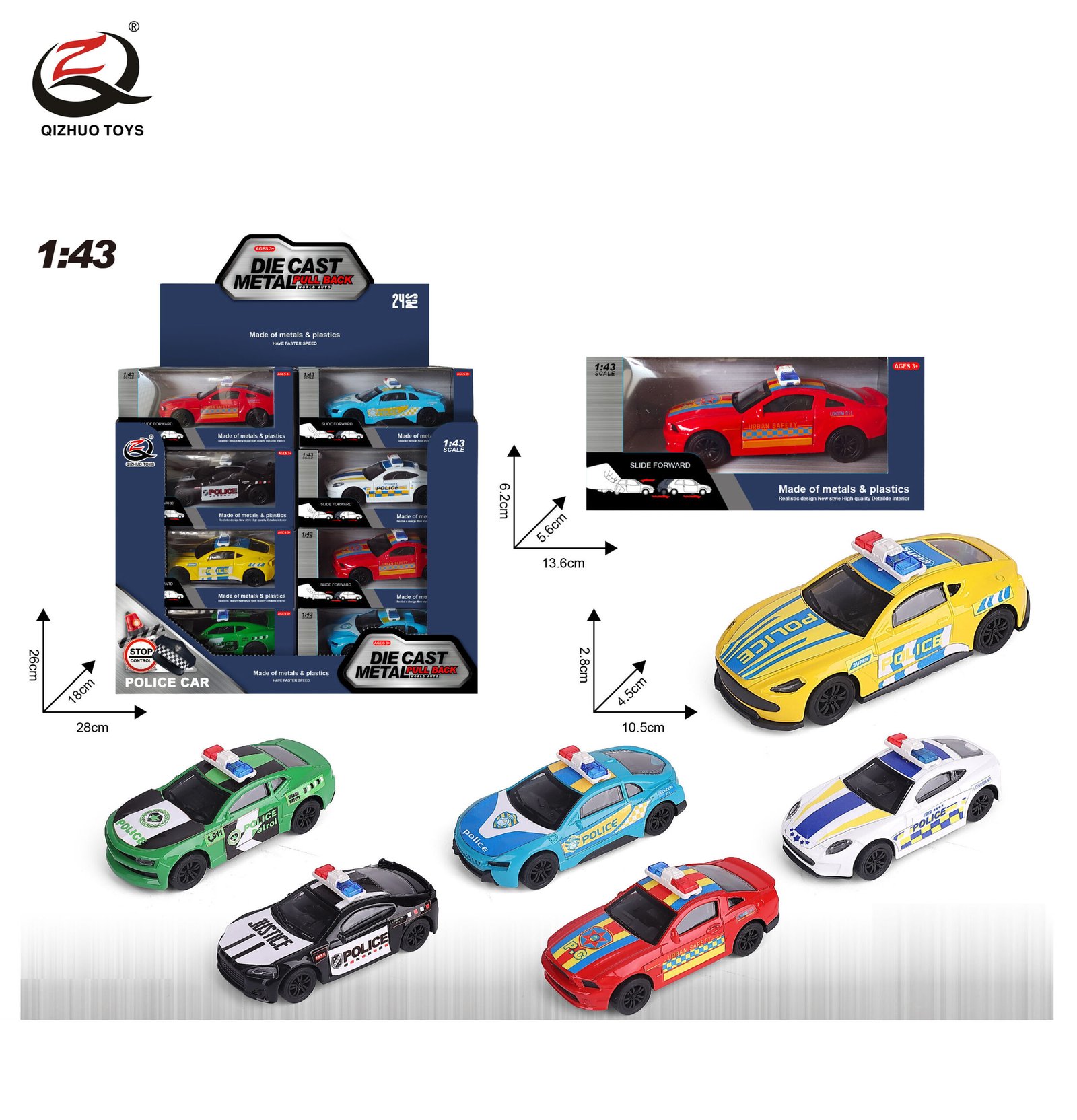 QZ626-G Scale 1:43 Police Die Cast Pull Back Car, 6 Assorted, 24 Pcs/Pdq